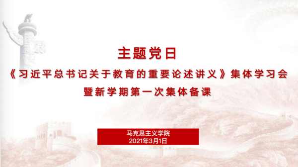 3月1日,马克思主义学院党总支以主题党日线上集体学习的形式,组织召开《习近平总书记关于教育的重要论述讲义》集体学习会暨新学期第一次集体备课。马克思主义学院党总支书记高丽娴、院长李晓平、院长助理金宇以及全体思政课教师参加集体学习,会议由金宇主持。